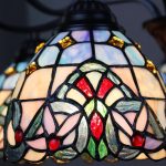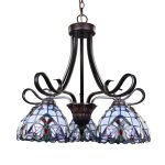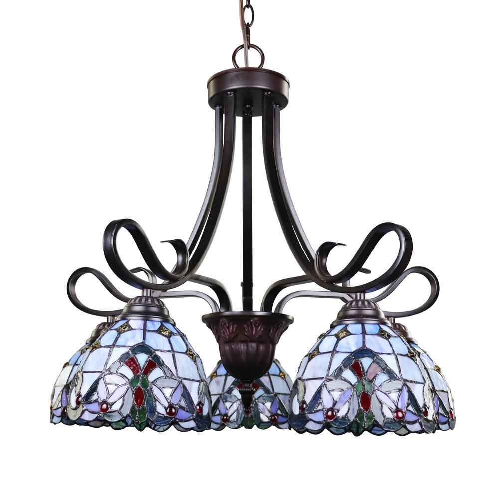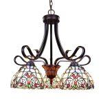 Grenville is a beautiful large chandelier, featuring 5 stained glass Victorian-style shades and a dark bronze canopy. This chandelier would be perfect to hang over a dining room table or over an entranceway. Each shade is handcrafted, using the same methods developed by Louis Comfort Tiffany in the early 1900s. This process entails using a total of 142 hand-cut stained art glass pieces and 16 glass beads, each wrapped in fine copper foil and soldered together at extremely high temperatures to form each unique piece. The exact size to the nearest inch may vary, and the exact color of each glass piece may vary due to each piece being handcrafted. The first image is with the light shining through, the second image is with no light. Dry listed and recommended for an indoor setting.