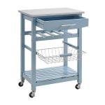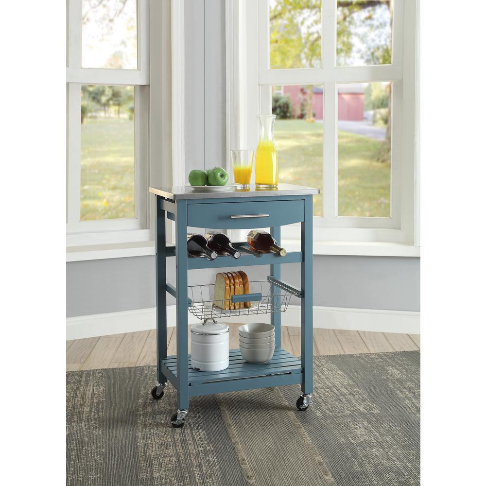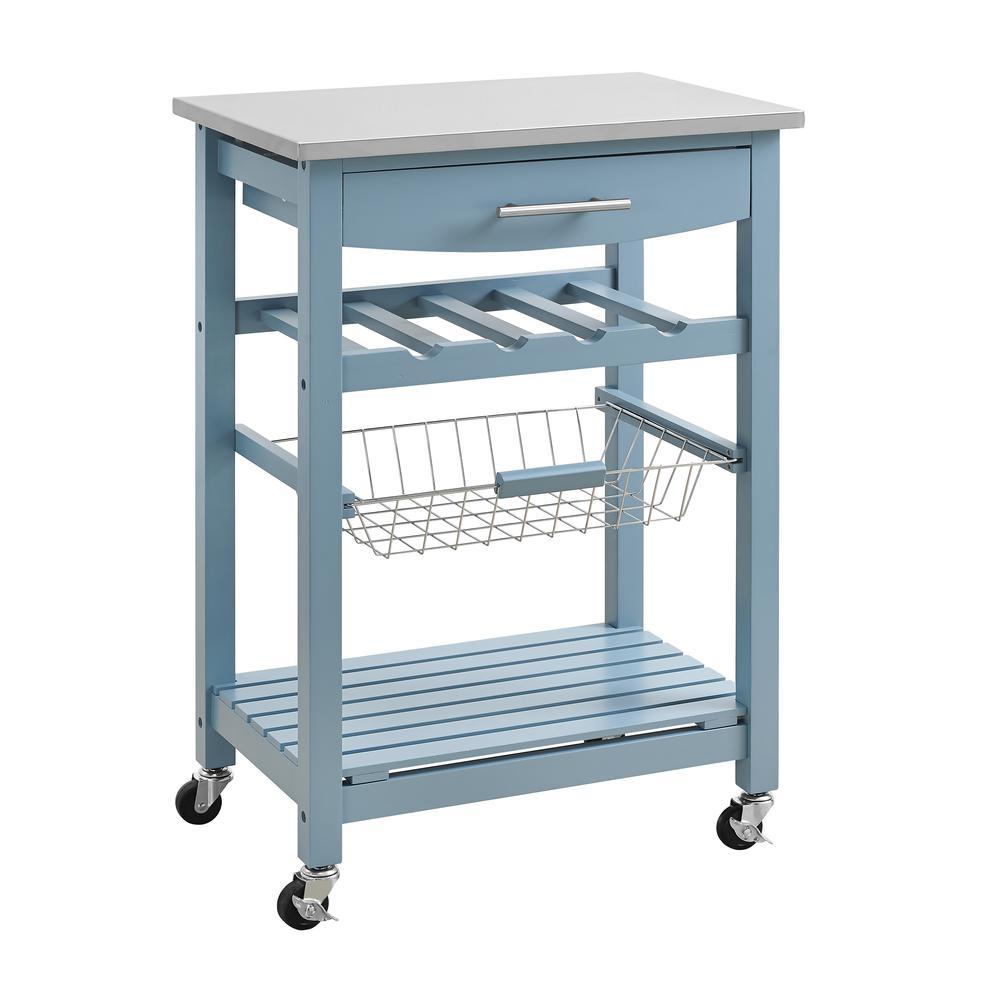 Simple, Durable Design With A Slate Blue Finish And Stainless Steel Hardware Food Safe, Easy To Maintain Stainless Steel Top Convenient Storage Including Front Drawer, Four Bottle Wine Rack, Wire Produce Basket And Bottom Shelf Easy Rolling, Secure Locking Casters Efficient Kitchen Storage And Food Preparation, Or Entertaining In Any Room Sturdy Solid Wood Frame Assembly Required