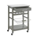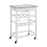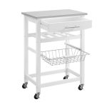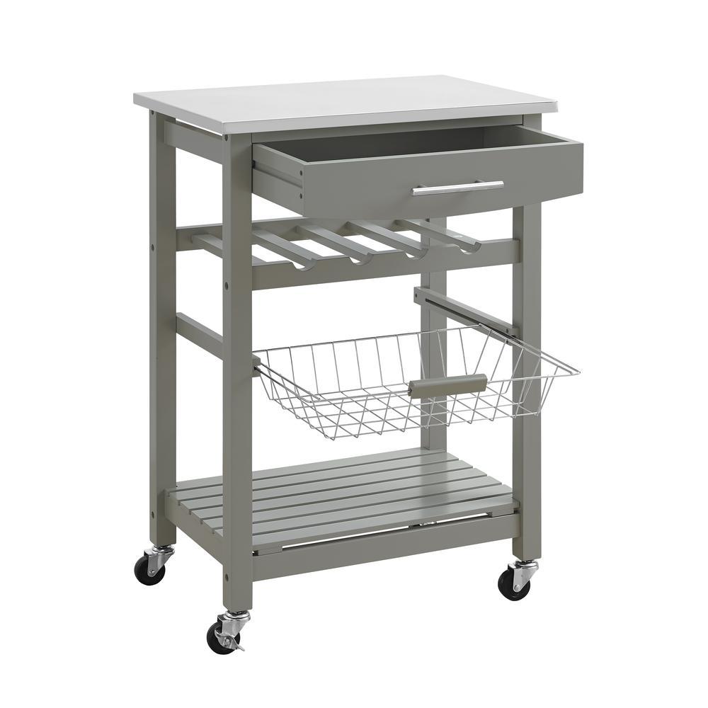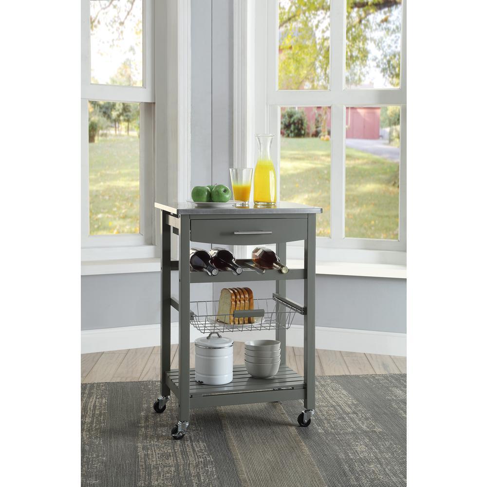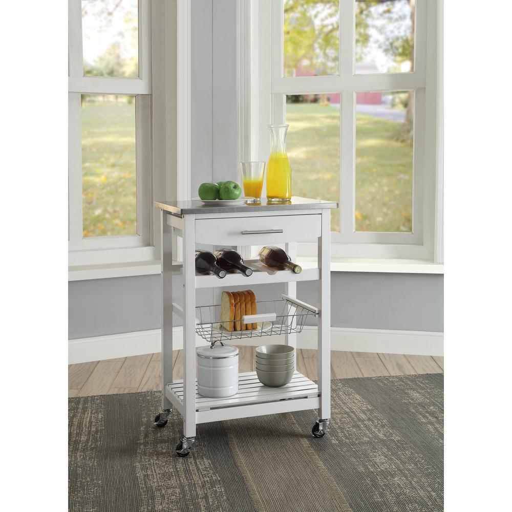 Prep Meals And Serve Drinks In Style With This Mobile Kitchen Cart. Its Top Drawer, Four Bottle Rack And Bottom Shelf Provide Ample Storage For Utensils, Wine, Dinnerware And More. Keep Produce Fresh In A Pull Out Wire Basket. The Food Safe, Stainless Steel Top, Suitable For A Coffee Maker Or Compact Microwave, Is Easy To Maintain. This Farmhouse Style Cart Gives A Fresh Appeal To Any Kitchen Or Entertainment Setting. It Glides Wherever You Need It On Durable, Locking Casters, Making Your Life Easier!
