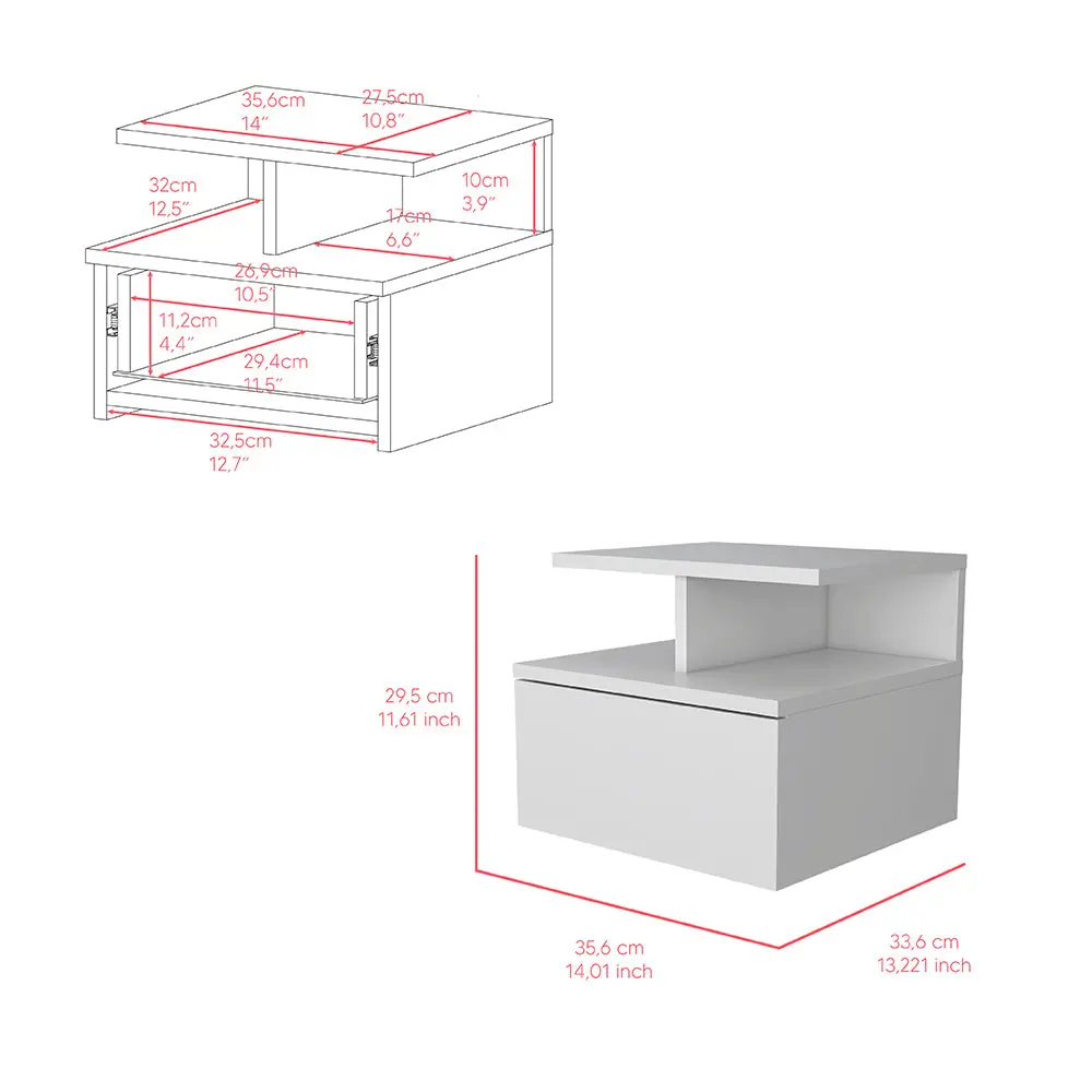 The Flopini floating nightstand was designed in a modern way, designed to give style to your bedroom. With one drawer, size (4.4″ H x 10.5″ W x 11.5″ D), and one shelf (14″ W x 10.8″ D), you can organize your book’s favs and accessories. Designed with an elegant white manufactured wood finish.