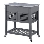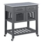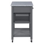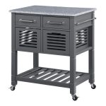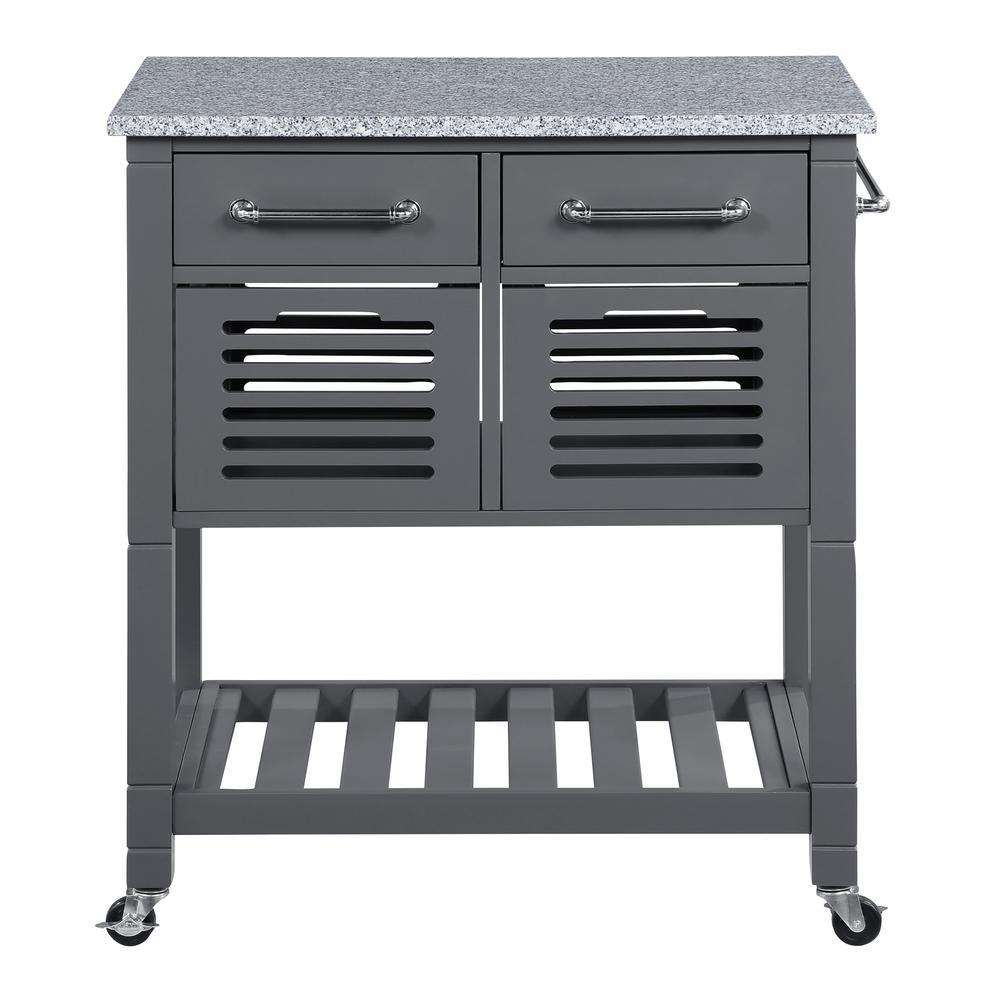 Capturing the classic charm of the modern farmhouse aesthetic, our Kitchen Cart with Granite Top, combines beauty and functionality. Its multifunctional design makes it perfect for food preparation, serving and kitchen storage. Beautiful from every angle, it features a solid wood painted finish, contrasted with the clean lines of a durable granite food prep surface. Two deep drawers will hold all your cooking utensils, while the two lower slatted storage drawers are ideal for storing large mixing bowls, serving pieces and kitchen linens. Towel bar and heavy-duty hardware provide long lasting appeal. A must-have addition to any home, this charming kitchen cart is sure to be your new favorite place for both cooking and dining.