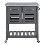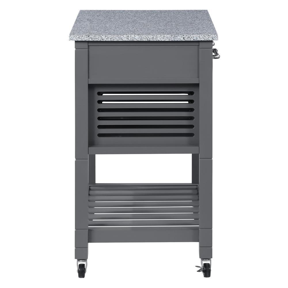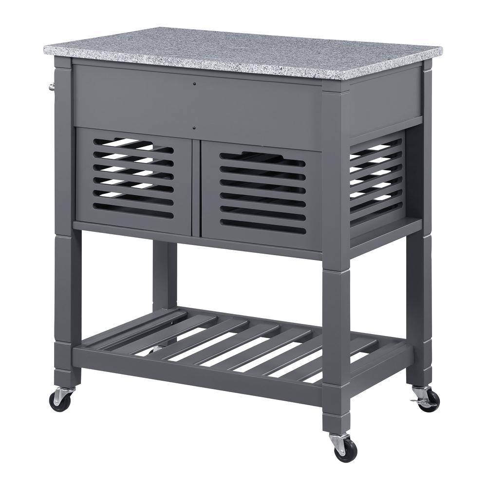 Farmhouse style Granite work surface Heavy duty towel bar and hardware 2 deep utensil drawers 2 large under-cabinet pull-out storage compartments Lower slatted shelving for pot display Durable painted finish Solid Wood Frame With Heavy-Duty Locking Casters